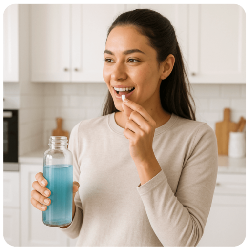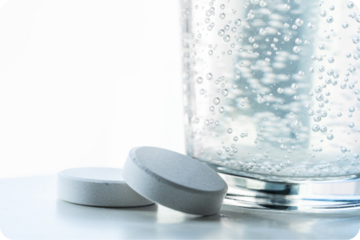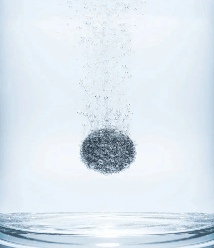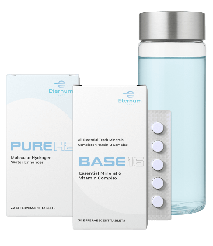 Drop 1 Base 16 tablet and 1 Pure H2 tablet into 300–500 mL of water. Let them fully dissolve, then drink with your usual supplements.